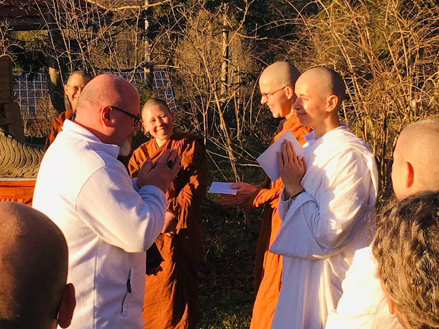 Als Käthi, die auch im Vorstand der Sati Stiftung ist, bei uns zum Retreat war, kam die Idee auf, den friedvollen Buddha, den wir gerade im Baumarkt bewundert hatten, als eine Ordinationsgabe zur Weihe von Vinita und Saccika zu schenken.
